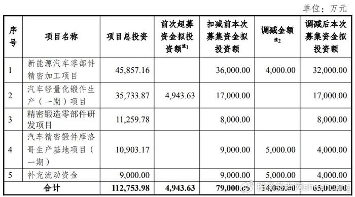 在可转债募资方面,公司最初计划向不特定对象发行可转换公司债券募集资金总额不超过 7.9 亿元,但由于前次募集资金中补充流动资金的金额超出了前次募集资金总额的 30%,为符合监管要求,公司对本次募资总额进行了调减,最终确定募资总额不超过 6.5 亿元。这笔资金的用途明确指向五大方向,其中新能源汽车零部件精密加工项目、汽车轻量化锻件生产(一期)项目、汽车精密锻件摩洛哥生产基地项目(一期)以及精密锻造零部件研发项目,均紧密围绕公司核心业务的升级与拓展,尤其是新能源领域的布局,而补充流动资金则将进一步优化公司的资金状况,为业务发展提供支撑。