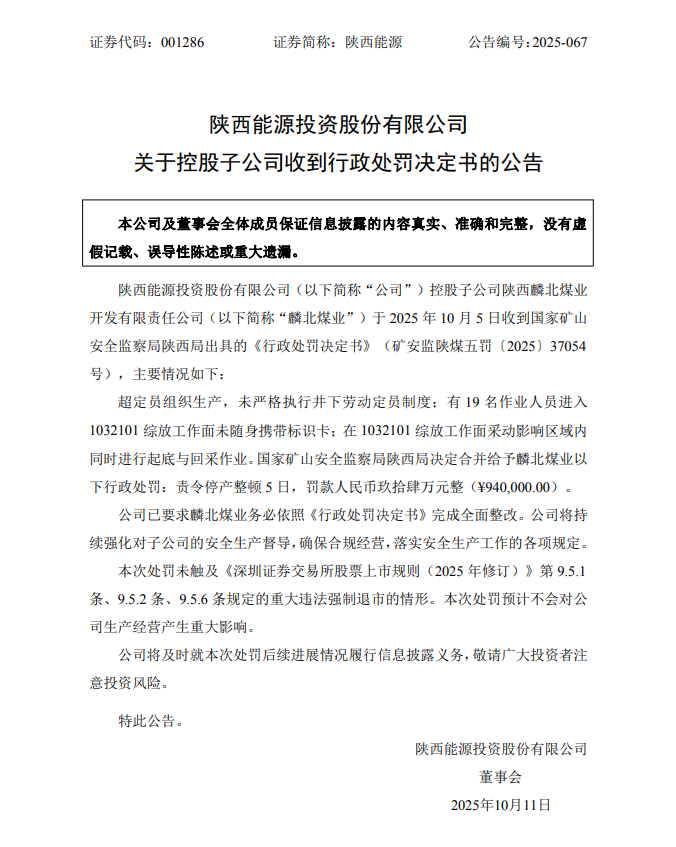10月11日,陕西能源(001286)公告称,公司控股子公司陕西麟北煤业开发有限责任公司(简称“麟北煤业”)于 2025 年10 月5 日收到国家矿山安全监察局陕西局出具的《行政处罚决定书》(矿安监陕煤五罚〔2025〕37054号),主要情况如下: