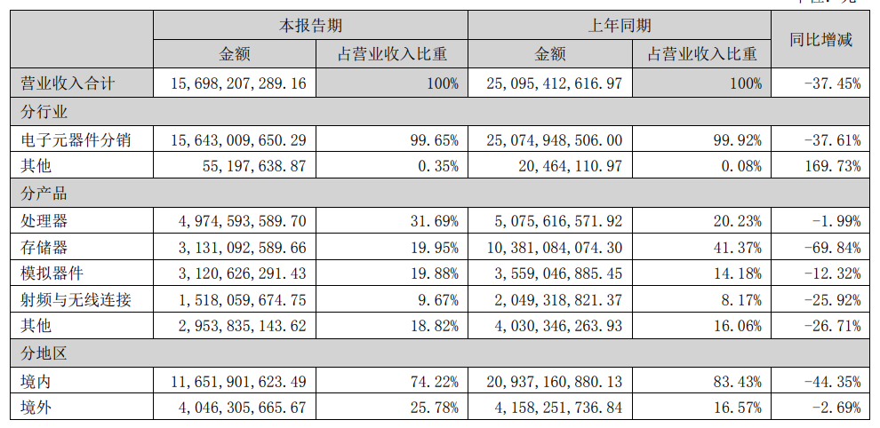 按产品线划分,报告期内处理器营收49.75亿元,占整体营收比重31.69%,同比减少1.99%;存储器营收31.31亿元,占整体营收比重19.95%;同比大减69.84%;模拟器件营收31.20亿元,占整体营收比重19.88%,同比减少12.32%;射频与无线连接营收15.18亿元,占整体营收比重9.67%,同比减少25.92%;其他产品营收29.54亿元,占整体营收比重18.82%,同比减少26.71%。