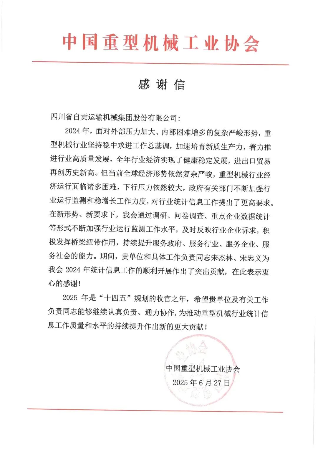 近日,中国重型机械工业协会2025年行业统计信息工作会议在南京召开。四川省自贡运输机械集团股份有限公司因在2024年行业统计工作中的突出贡献,荣获协会感谢信,公司具体负责统计工作的宋杰林、宋忠义获点名表彰。