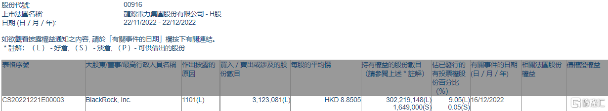根据联交所最新权益披露资料显示,2022年12月16日,龙源电力(00916.HK)获BlackRock, Inc.在场内以每股均价8.8505港元增持好仓312.31万股,涉资约2764.08万港元。