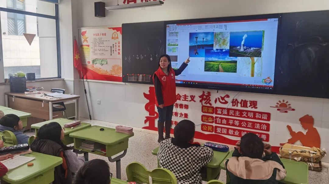 青年志愿者前往当地小学开展新能源知识进校园活动,为同学们科普风力发电、光伏发电小知识。