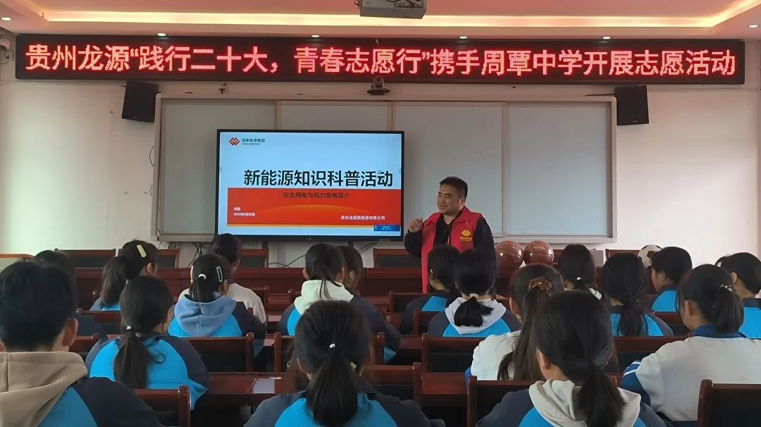 青年志愿者赴贵州省黔南州三都周覃中学开展“新能源知识进校园”活动,用通俗易懂的语言,为同学们讲解风力发电、安全用电、触电急救等方面知识。