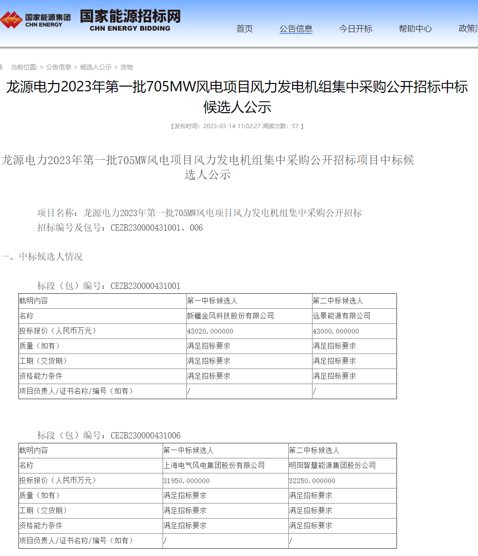 3月14日,龙源电力2023年第一批705MW风电项目风力发电机组集中采购公开招标中标候选人公示,本次招标为两个标包,规模共计350MW。其中:金风科技预中标200MW,投标报价4.3亿元;电气风电预中标150MW,投标报价3.195亿元。