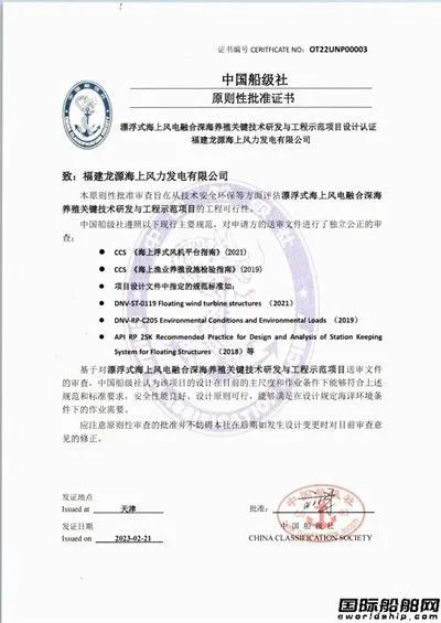 此次获得CCS批准证书,为项目顺利并网投产、安全运营提供有力技术保障,为我国深远海漂浮式风电开发及深海渔业养殖相融合起到良好的示范意义。