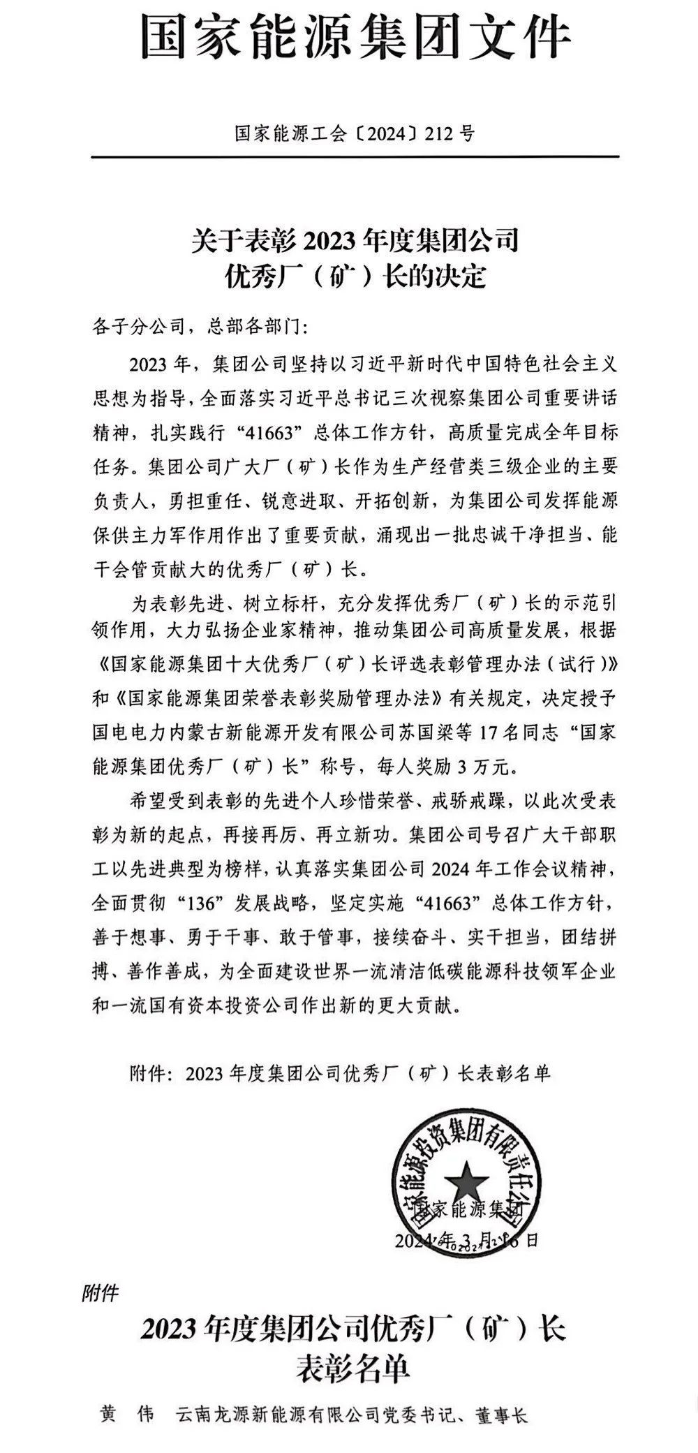 近日,国家能源集团印发了《关于表彰2023年度集团公司优秀厂(矿)长的决定》,龙源云南公司党委书记、董事长黄伟同志被授予“国家能源集团优秀厂(矿)长”称号。