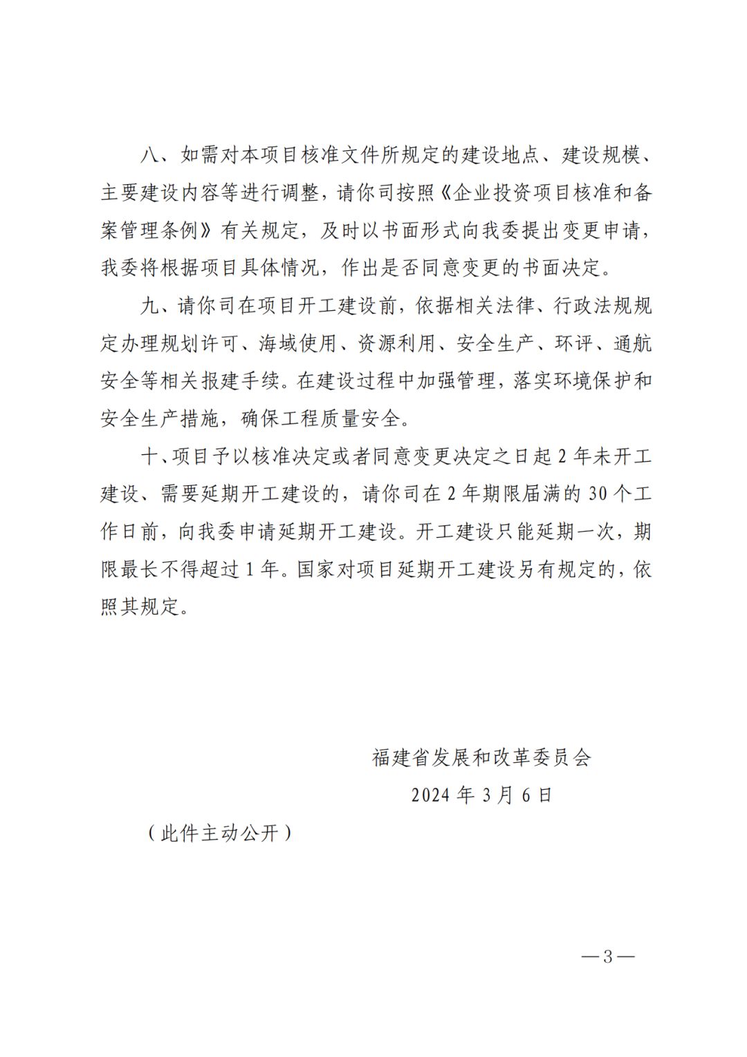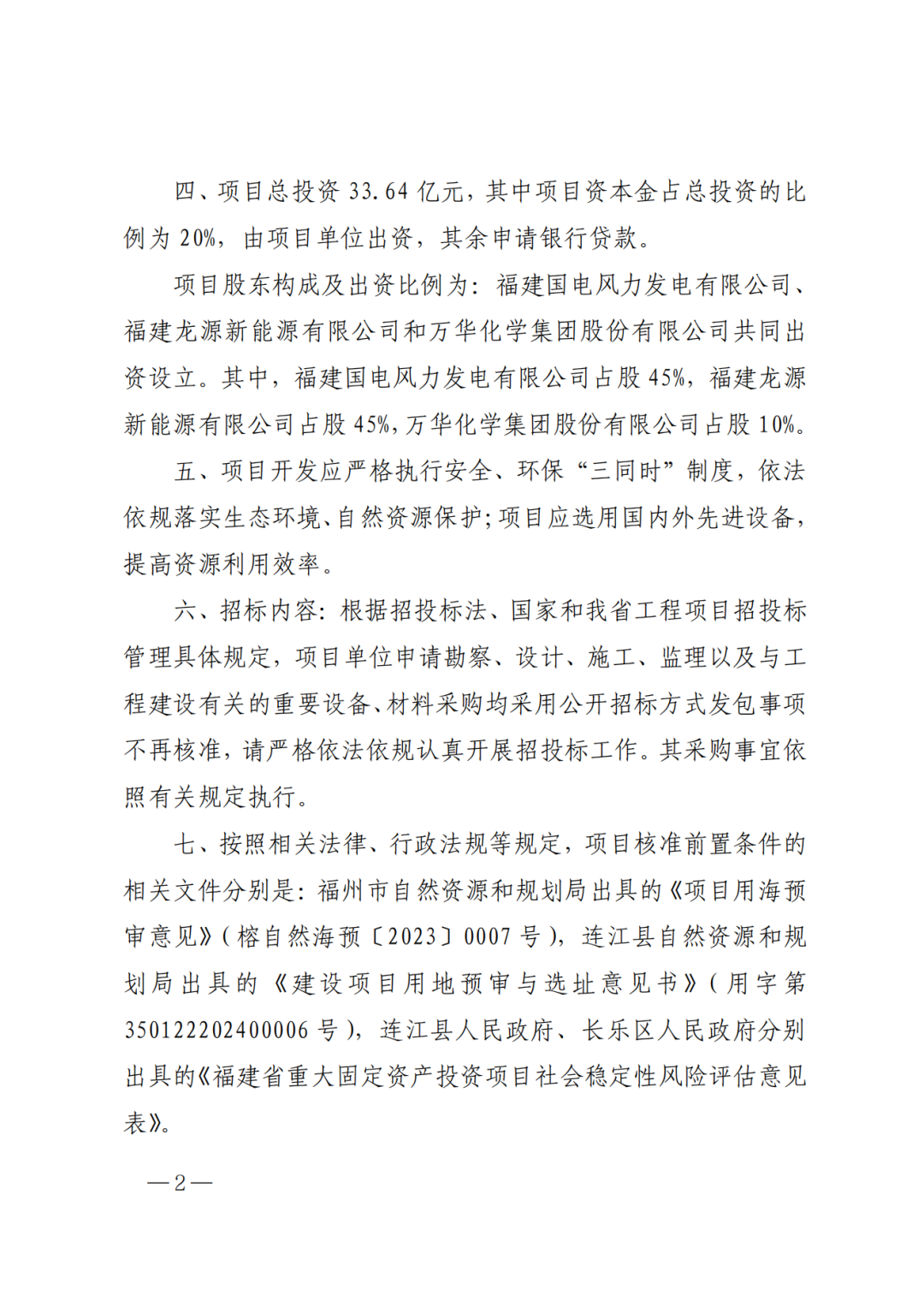 根据公告,该项目位于福建省福州市连江县和长乐区,区域风资源富集,建设条件良好,规划装机容量300兆瓦,新建1座220千伏海上升压站和1座陆上集控站,配套建设30兆瓦/60兆瓦时储能设施。项目建成投产后,预计每年可为电网提供清洁电量约14.34亿千瓦时,每年可节约标煤43.96万吨,减排二氧化碳120.25万吨、二氧化硫268.29吨、二氧化氮279.78吨、烟尘54.52万吨,具有良好的经济效益、社会效益和环境效益,有效改善地区能源结构,促进地区经济可持续发展。