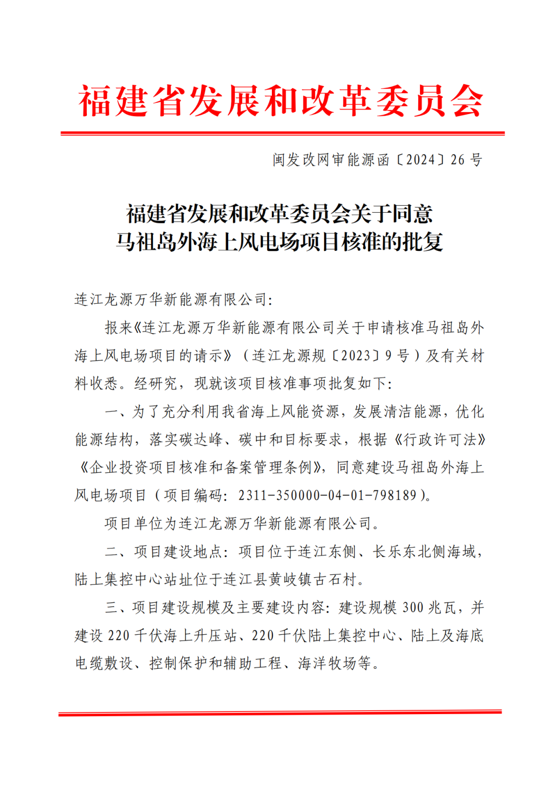 风芒能源获悉,近日,龙源电力福建公司马祖岛外300兆瓦海上风电项目获福建省发展和改革委员会核准批复,为项目合规开发建设奠定基础。