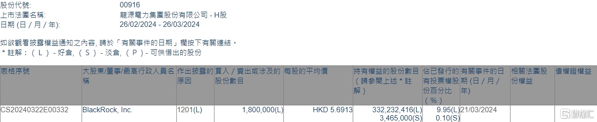 根据联交所最新权益披露资料显示,2024年3月21日,龙源电力(00916.HK)遭BlackRock, Inc.在场内以每股均价5.6913港元减持好仓180万股,涉资约1024.43万港元。