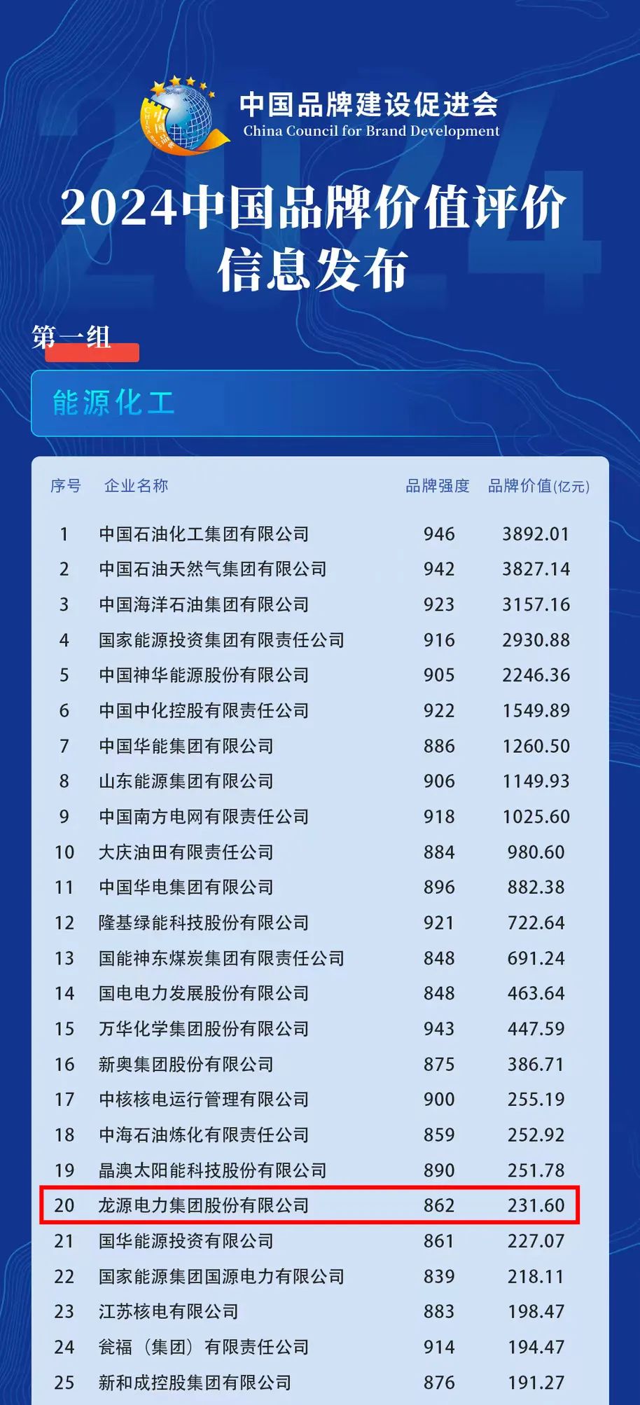 5月11日,新华社、中国品牌建设促进会等单位在浙江联合发布“2024中国品牌价值评价信息”榜单,龙源电力集团以其在新能源领域的卓越表现和品牌建设的显著成效,荣获能源化工领域第20名,品牌价值达到231.60亿元。
