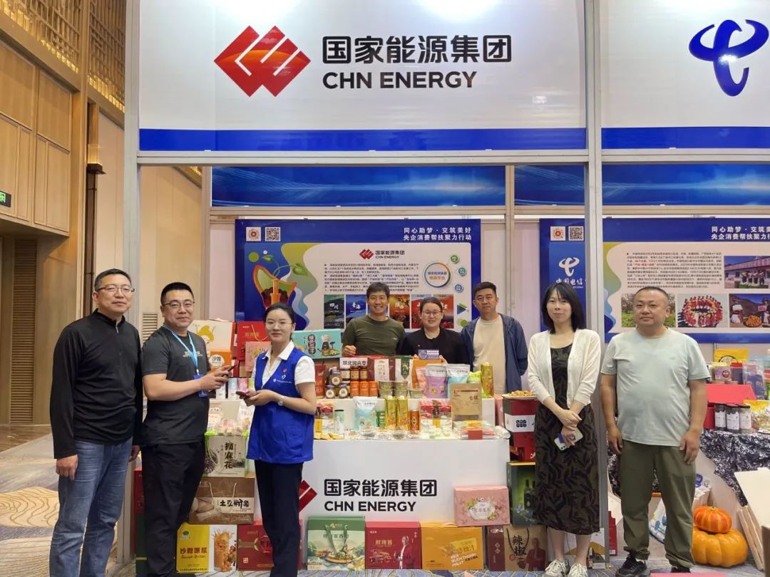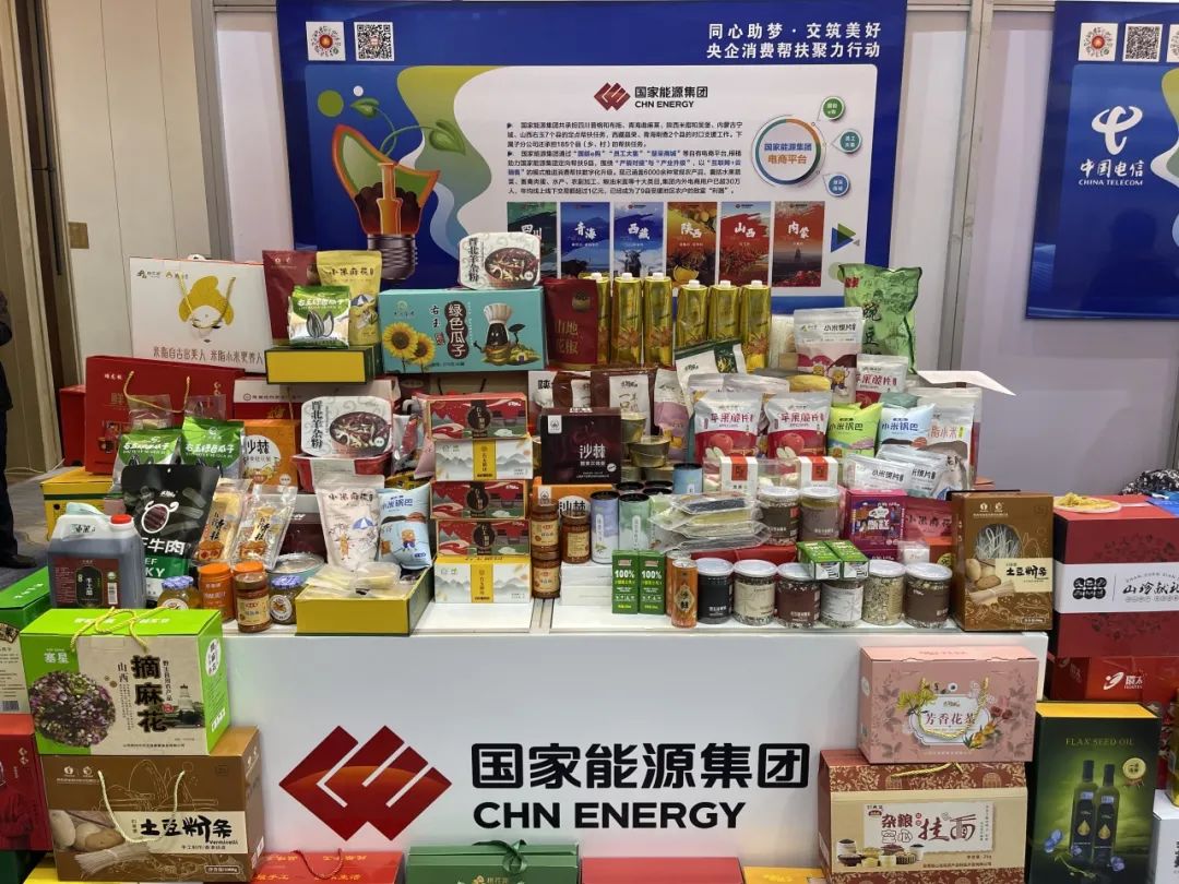 龙源电力帮扶地区特色产品推介展位上,右玉羊肉、杂粮、亚麻籽油、葵花籽、沙棘系列产品等特色农副产品备受瞩目,吸引众多消费者品鉴购买。