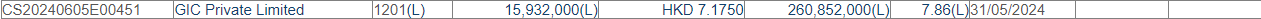 减持后,GIC Private Limited最新持股数目为260,852,000股,持股比例由8.34%下降至7.86%。