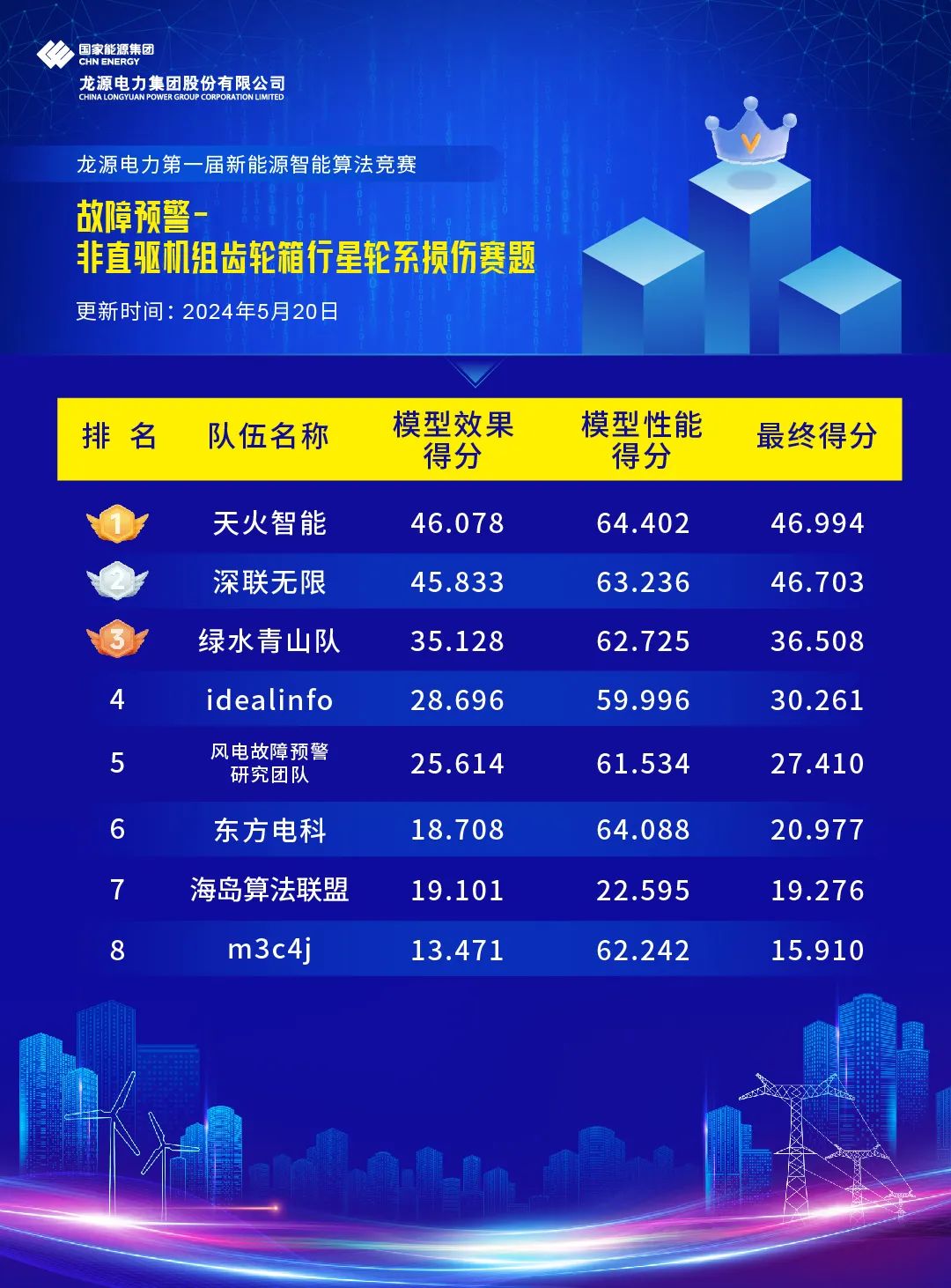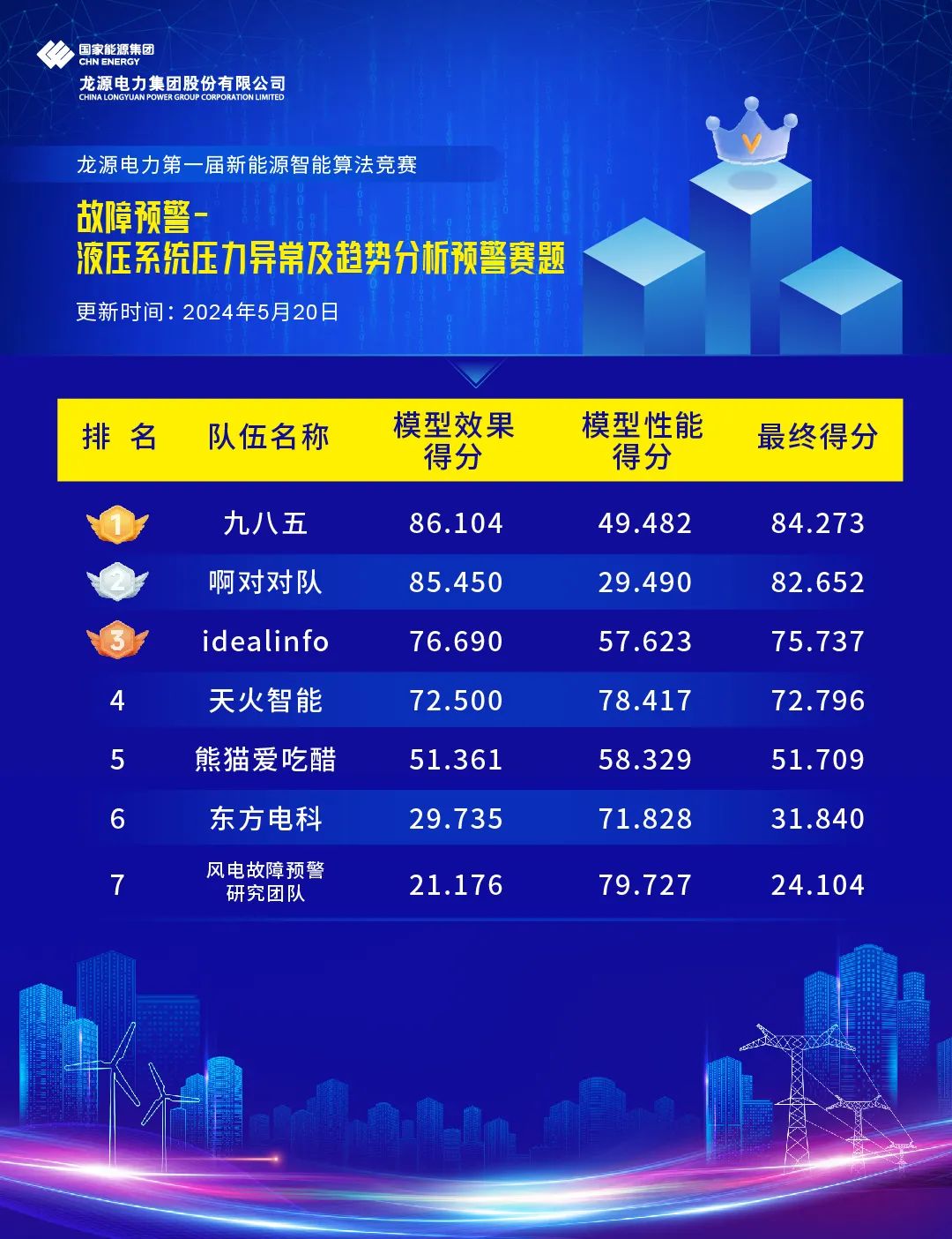 近日,龙源电力新能源智能算法竞赛陆续完成故障预警、功率预测、图像识别三个赛道的首轮比赛。该竞赛以探索算法模型在新能源行业生产实践应用为宗旨,在北京、西安等八座城市分别设置竞赛场地,累计吸引252支团队报名参赛。