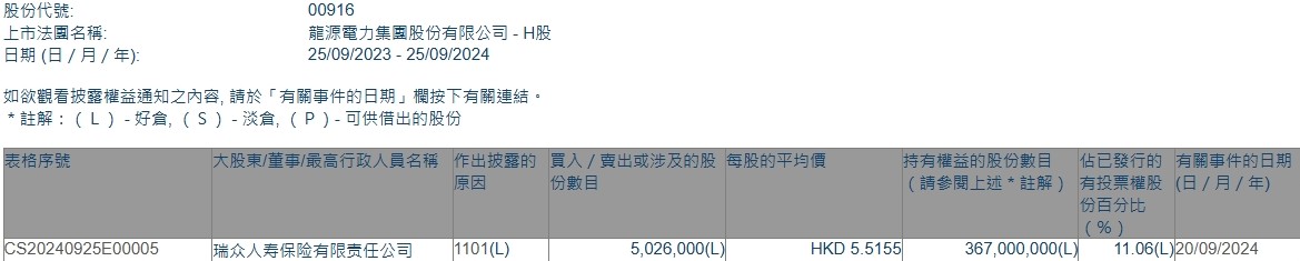 香港联交所最新资料显示,9月20日,瑞众人寿增持龙源电力(00916)502.6万股,平均每股作价为5.5155港元,总金额约为2772.09万港元。增持后最新持股数目为3.67亿股,最新持股比例为11.06%。