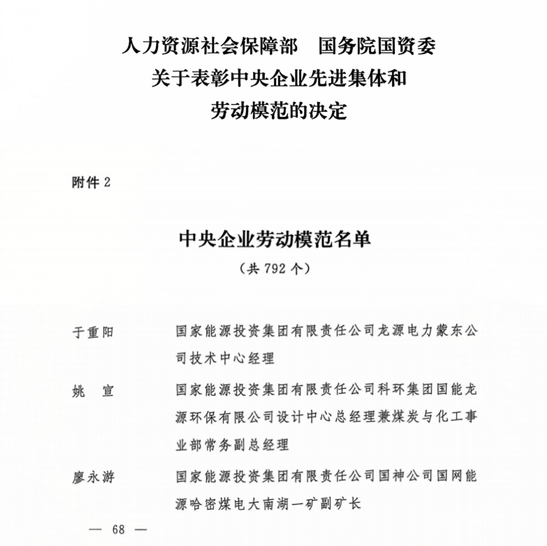 9月26日,国务院国资委、人力资源和社会保障部共同召开了中央企业先进集体和劳动模范表彰大会,表彰先进集体和劳动模范,国家能源集团龙源电力蒙东公司于重阳荣获“中央企业劳动模范”荣誉称号。