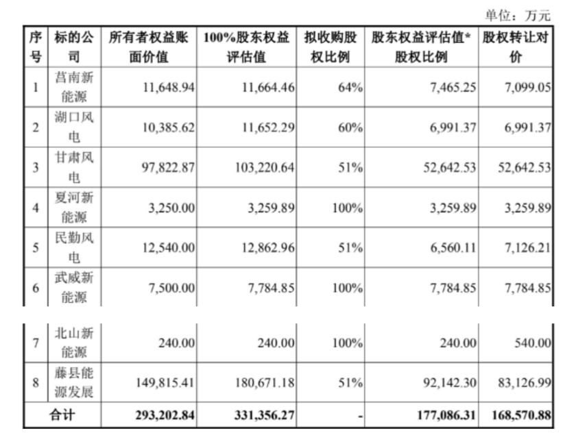 公告显示,龙源电力此次收购的标的涵盖了莒南新能源64%的股权、湖口风电60%的股权、甘肃风电51%的股权、夏河新能源100%的股权、民勤风电51%的股权、武威新能源100%的股权、北山新能源100%的股权以及藤县能源发展51%的股权。