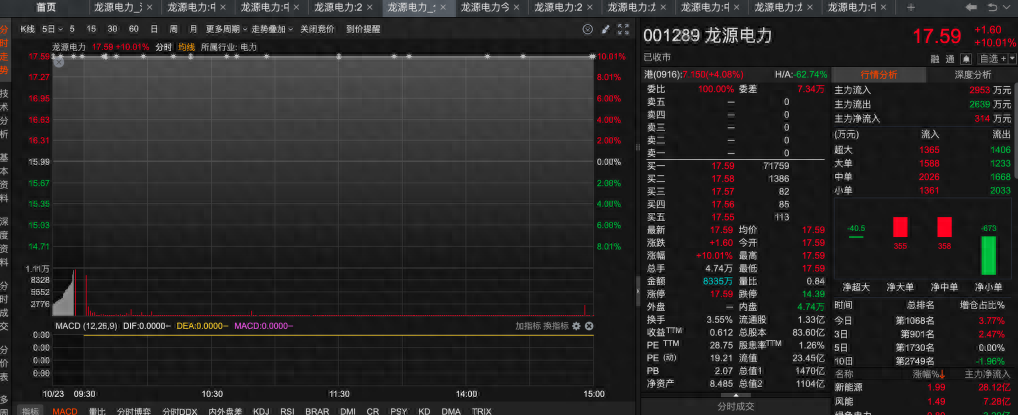 在2024年上半年业绩有所下滑的背景下,此次收购不仅有望增厚公司业绩,更作为利好在市场上引发了积极反响。10月23日,龙源电力股票开盘涨停,截至收盘,股价17.59元,涨幅达到10.01%,总市值为1470亿元,充分表明市场对本次收购的认可。
