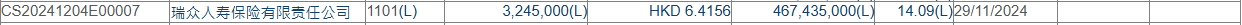 增持后,瑞众人寿保险有限责任公司最新持股数目为467,435,000股,持股比例由13.99%上升至14.09%。