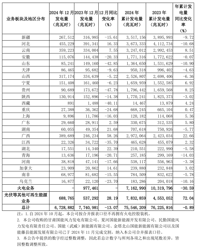 截至2024年12月31日,本公司2024年累计完成发电量75,546,209兆瓦时,较2023年同期同比下降0.89%,主要由于公司本年火电控股装机减少所致。其中,风电发电量下降1.31%,光伏等其他可再生能源发电量增长72.04%,火电发电量下降30.59%。