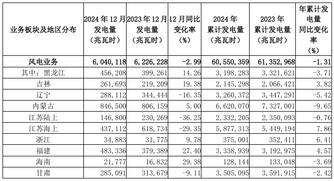 1月14日,龙源电力发布公告称,本公司2024年12月按合并报表口径完成发电量6,728,882兆瓦时,较2023年同期同比下降13.07%。其中,风电发电量下降2.99%,主要由于公司项目所在区域12月平均风速较上年同期下降所致;光伏等其他可再生能源发电量增长28.19%;本公司不再拥有火电控股装机,本月未产生火电发电量。