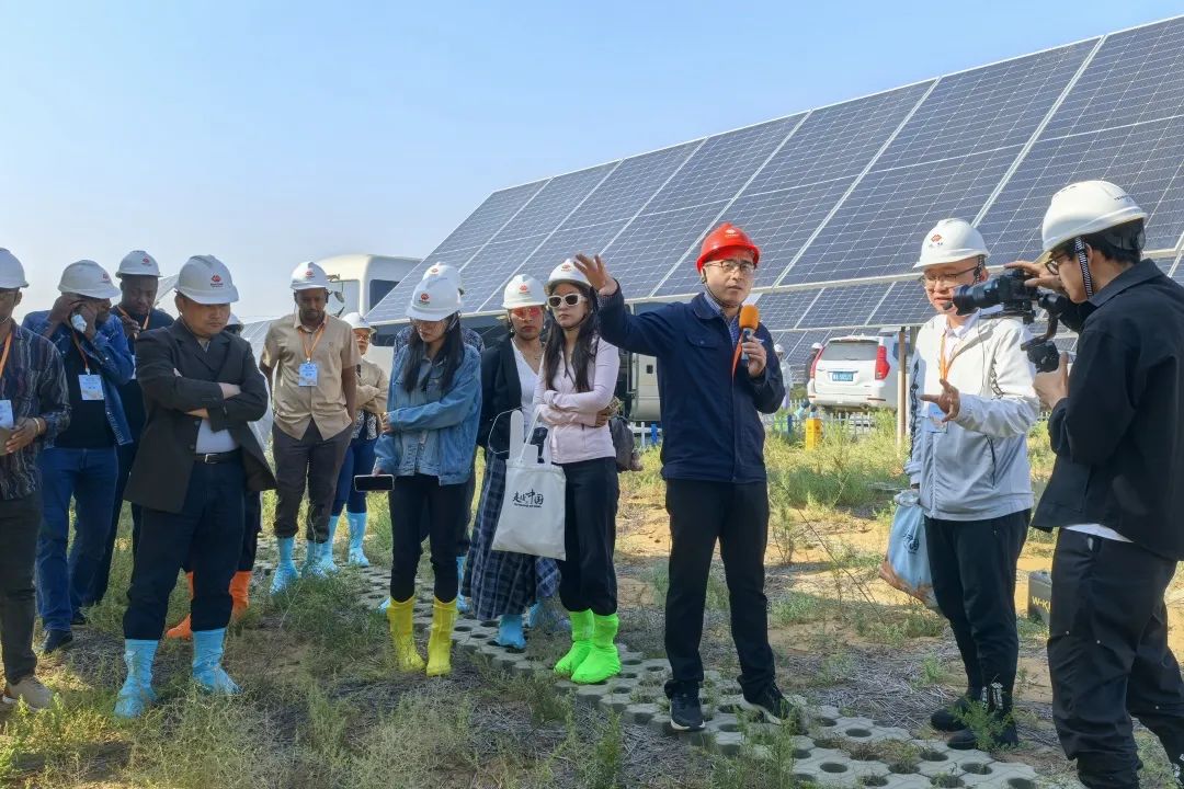 图为外国记者参观宁夏腾格里沙漠新能源基地