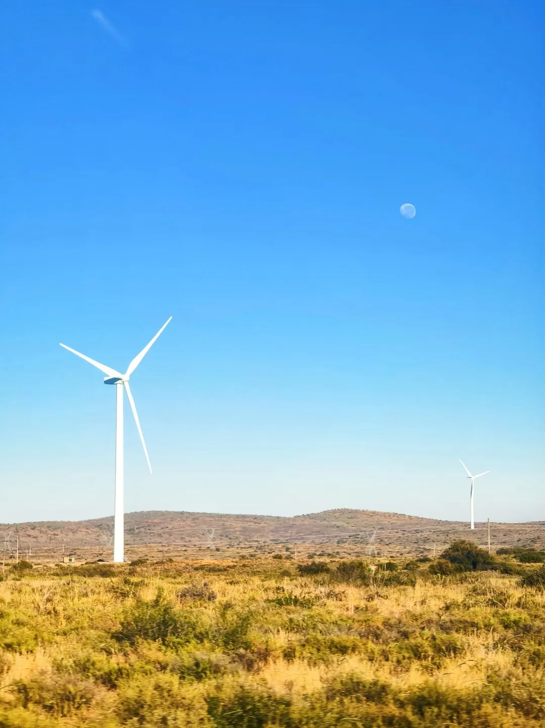 2024年,“光伏先遣队”初战告捷,连片的光伏板铺展成一望无际的“蓝海”。当项目部工程师鲁俊指着上百万块光伏板进行讲解时,来这里参观学习的龙源电力南非德阿风电场本地员工达思文直呼:“超大规模!难以置信!这样的能源发展经验值得向全世界推广!”