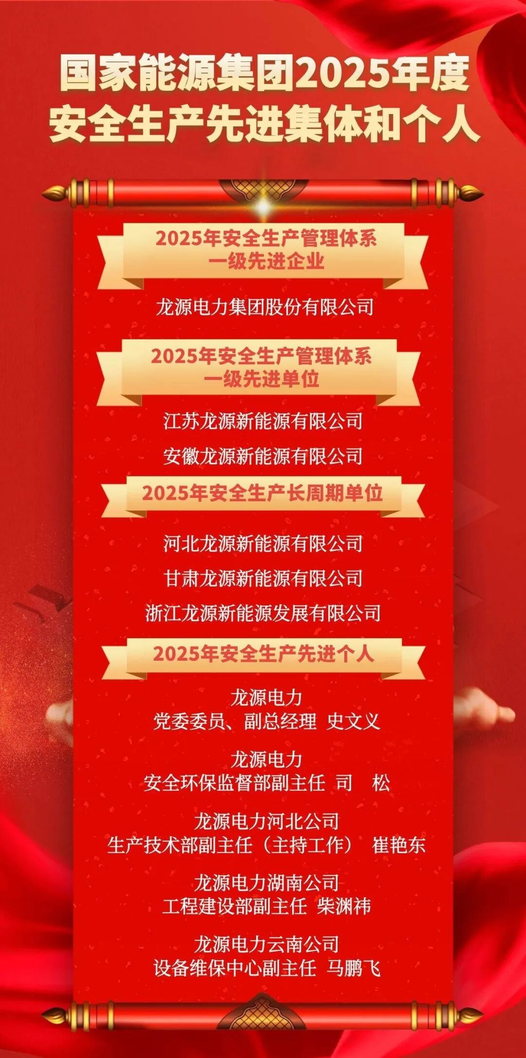 近日,集团公司印发《关于表彰奖励国家能源集团2025年度安全生产先进集体和个人的通知》,龙源电力获评“2025年安全生产管理体系一级先进企业”,2家单位获评“2025年安全生产管理体系一级先进单位”,2家单位获评“2025年安全生产长周期单位”,3家单位获评“2025年安全生产长周期单位”,5人获评“2025年安全生产先进个人”。