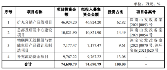 好上好2022年9月20日披露的招股书显示,公司原拟募资74,690.79万元,拟用于“扩充分销产品线项目”、“总部及研发中心建设项目”、“物联网无线模组与智能家居产品设计及制造项目”、“补充流动资金项目”。