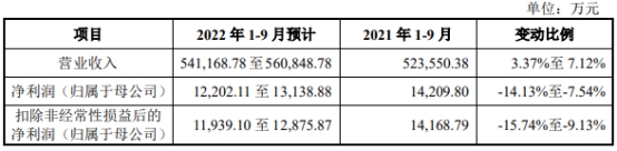 结合公司的实际经营状况,经初步测算,公司2022年1-9月的营业收入预计为541,168.78万元至560,848.78万元,同比变动3.37%至7.12%;预计净利润(归属于母公司)12,202.11万元至13,138.88万元,同比变动-14.13%至-7.54%;预计扣除非经常性损益后的净利润(归属于母公司)11,939.10万元至12,875.87万元,同比变动-15.74%至-9.13%。