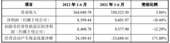 2022年1-6月,好上好营业收入为364,048.78万元,同比增长3.86%;净利润(归属于母公司)为8,599.44万元,同比下降10.44%;扣除非经常性损益后的净利润(归属于母公司)为8,400.78万元,同比下降12.29%;经营活动产生现金流量净额为24,189.43万元,上年同期为-33,688.41万元。