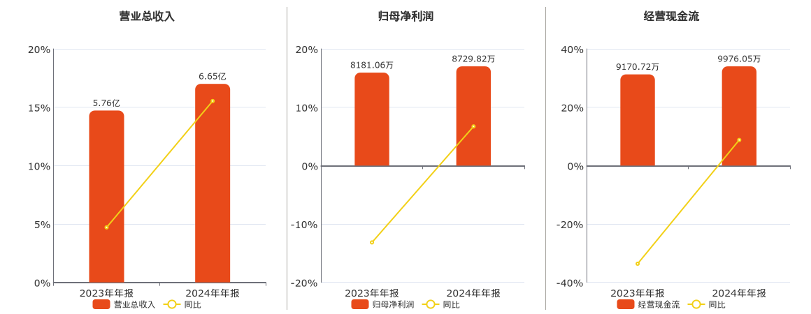 公司营业总收入为6.65亿元。归母净利润为8729.82万元。经营活动现金净流入为9976.05万元。