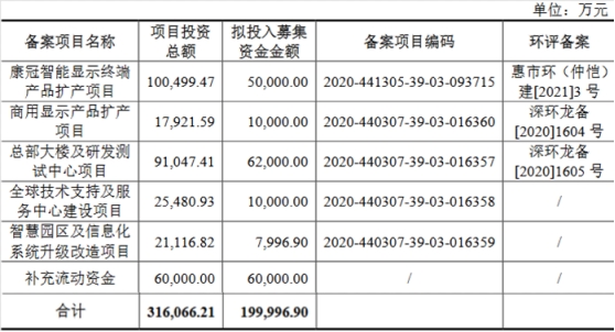 康冠科技本次发行募集资金总额为20.75亿元,扣除发行费用后,募集资金净额20.00亿元。该公司最终募集资金净额与原计划一致。康冠科技于2022年3月7日披露的招股说明书显示,公司拟募集资金20.00亿元,拟分别用于康冠智能显示终端产品扩产项目、商用显示产品扩产项目、总部大楼及研发测试中心项目、全球技术支持及服务中心建设项目、智慧园区及信息化系统升级改造项目和补充流动资金。其中计划用于补充流动资金的募集资金金额为6亿元。