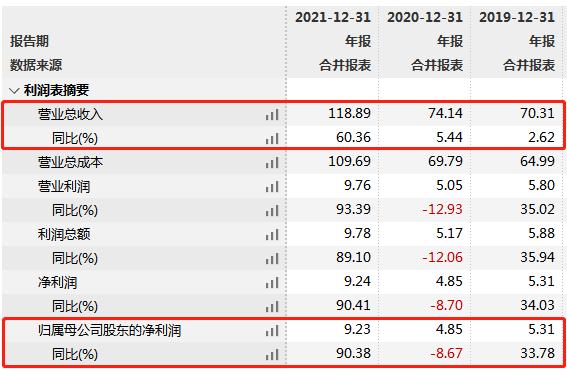 2019年-2021年,康冠科技的营业收入分别为70.31亿元、74.14亿元和118.89亿元,同比增长率分别为2.62%、5.44%和60.36%;归母净利润分别为5.31亿元、4.85亿元和9.23亿元,同比增长率分别为33.78%、-8.67%和90.38%。