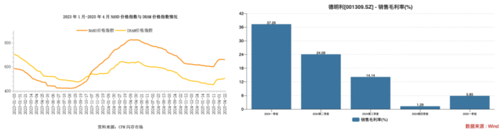 进一步研究发现,公司的毛利率表现并不稳定。根据CFM闪存市场数据,NAND Flash价格指数在经历2024年上半年的上涨后,于下半年出现回落,产品价格徘徊底部。2025年一季度,存储价格逐渐趋于稳定,并在3月底逐步回暖。