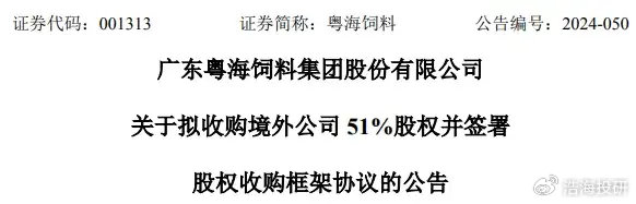 根据公告显示,粤海饲料正在筹备收购I&V Bio Asia Co.,Ltd.51%股权,已签署股权收购框架协议。