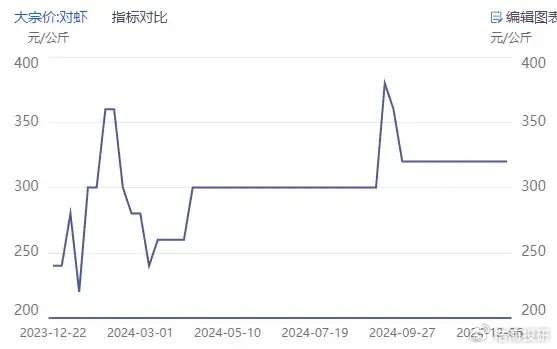 但从数据来看,下半年水产市场已有所回暖。以对虾价格为例,上半年一度低至220元/公斤,但自10月起已基本稳定在320元/公斤。