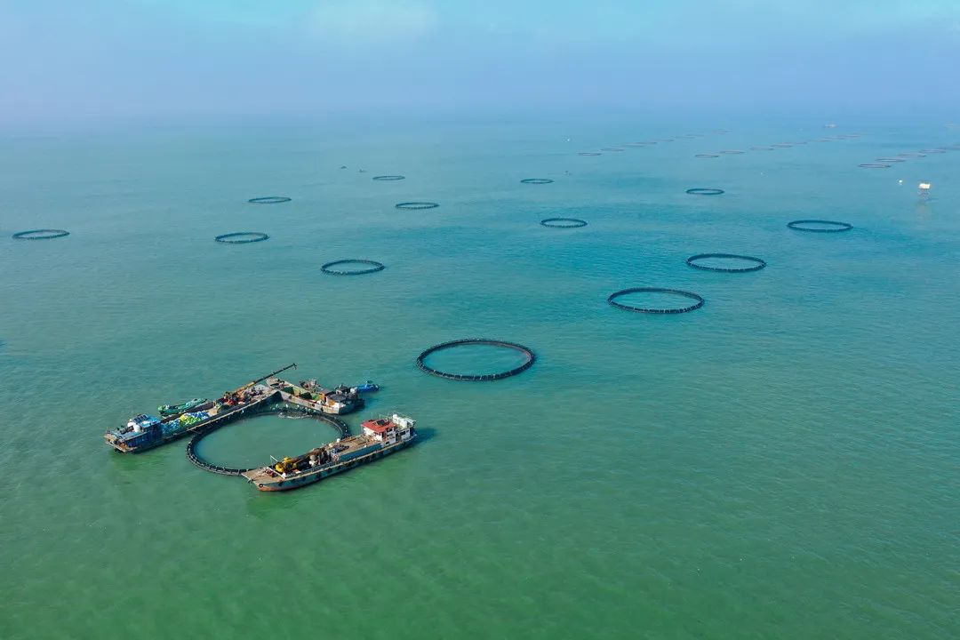 ▲金鲳鱼深海网箱养殖场景