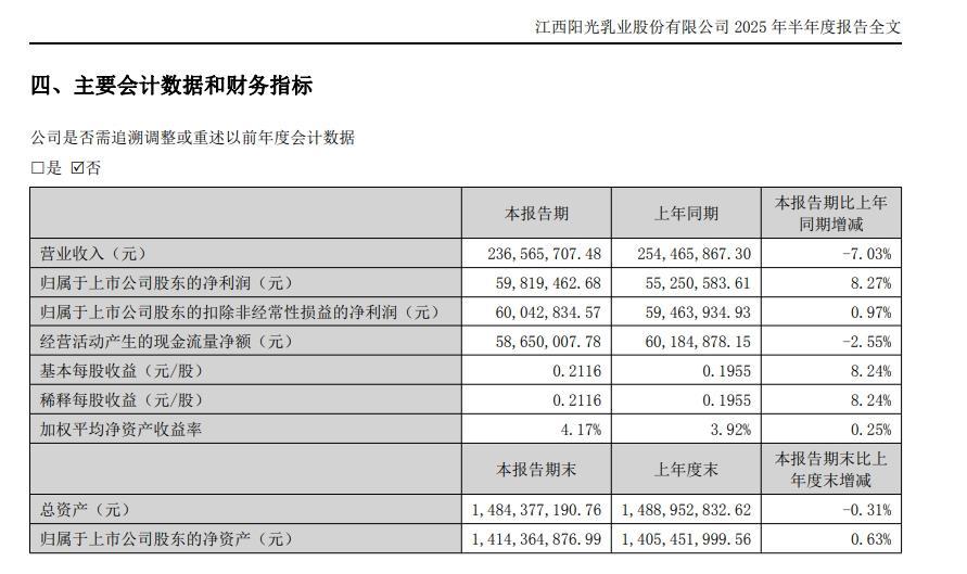 8月19日晚间,阳光乳业披露了2025年半年报。报告显示,公司上半年实现营业收入2.37亿元,同比下降7.03%;而归属于上市公司股东的净利润为5981.95万元,同比增长8.27%;基本每股收益为0.2116元。