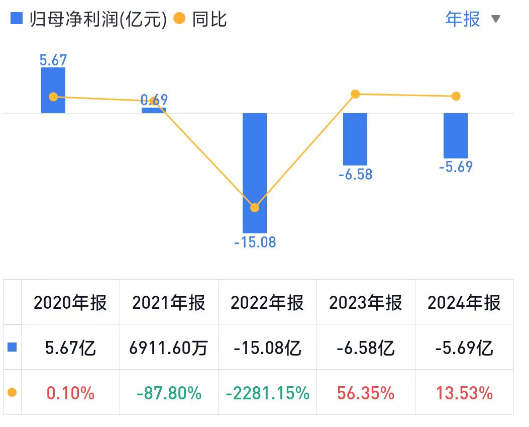 帝欧家居不仅营收靠后,归母净利润在6个企业中也排在末位。数据显示,2024年帝欧家居归母净利润为-5.69亿元,这已经是其连续三年陷入亏损状态。