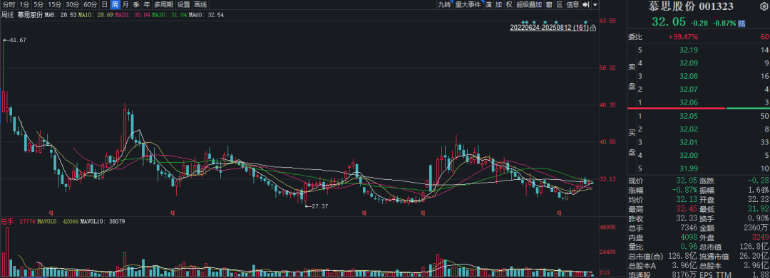上市初期,慕思股份的股价(除权)便一度摸高至61.67元/股,但随后又迅速下行。之后的三年多时间里,股价整体呈现低位震荡的形态,2024年初一度触及27.37元/股的低点。截至8月12日收盘,股价为32.05元/股,虽然相较低谷已有将近50%的反弹,但也只有峰值价的一半左右,同时也仍旧低于发行价格。