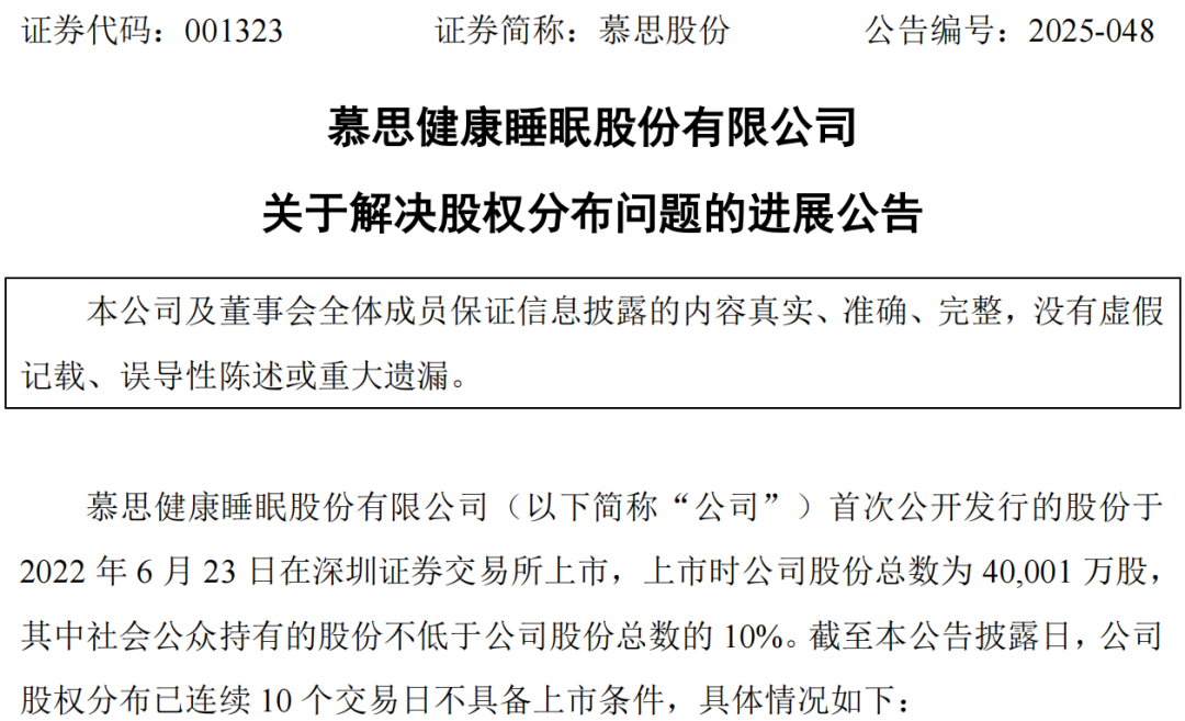 近日,慕思健康睡眠股份有限公司(001323.SZ,以下简称“慕思股份”)发布公告称,公司股权分布已连续10个交易日未满足“社会公众持股比例不低于总股本10%”的上市条件,并对原因及后续解决方案作出说明。