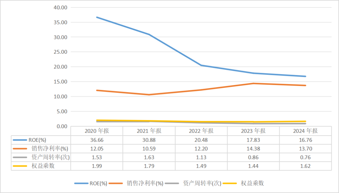 公司的ROE(净资产收益率)却下滑明显,近5年间从36.66%连续降至16.76%,减幅过半。对其进行拆解可发现,销售净利率和权益乘数相对稳定,资产周转率则下滑明显,从1.53减至0.76,近乎腰斩,其变化幅度与ROE的变化接近,因此是拖累净资产收益率的主要因素。
