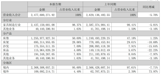 其他品类则普遍承压:床架产品同比下降10.68%至6.95亿元;沙发产品则同比下降15.64%至1.76亿元;床品则同比下降22.23%至1.16亿元;其他类同比下降7.97%至1.94亿元,其他业务同比下降3.16%至4044.06万元。