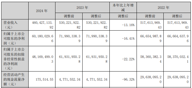 长青科技(001324.SZ)2024年年度报告显示,公司2024年实现营业收入4.60亿元,同比下降13.16%;归属于上市公司股东的净利润6018.00万元,同比下降16.41%;归属于上市公司股东的扣除非经常性损益的净利润4816.95万元,同比下降22.22%;经营活动产生的现金流量净额17.55万元,同比下降96.32%。