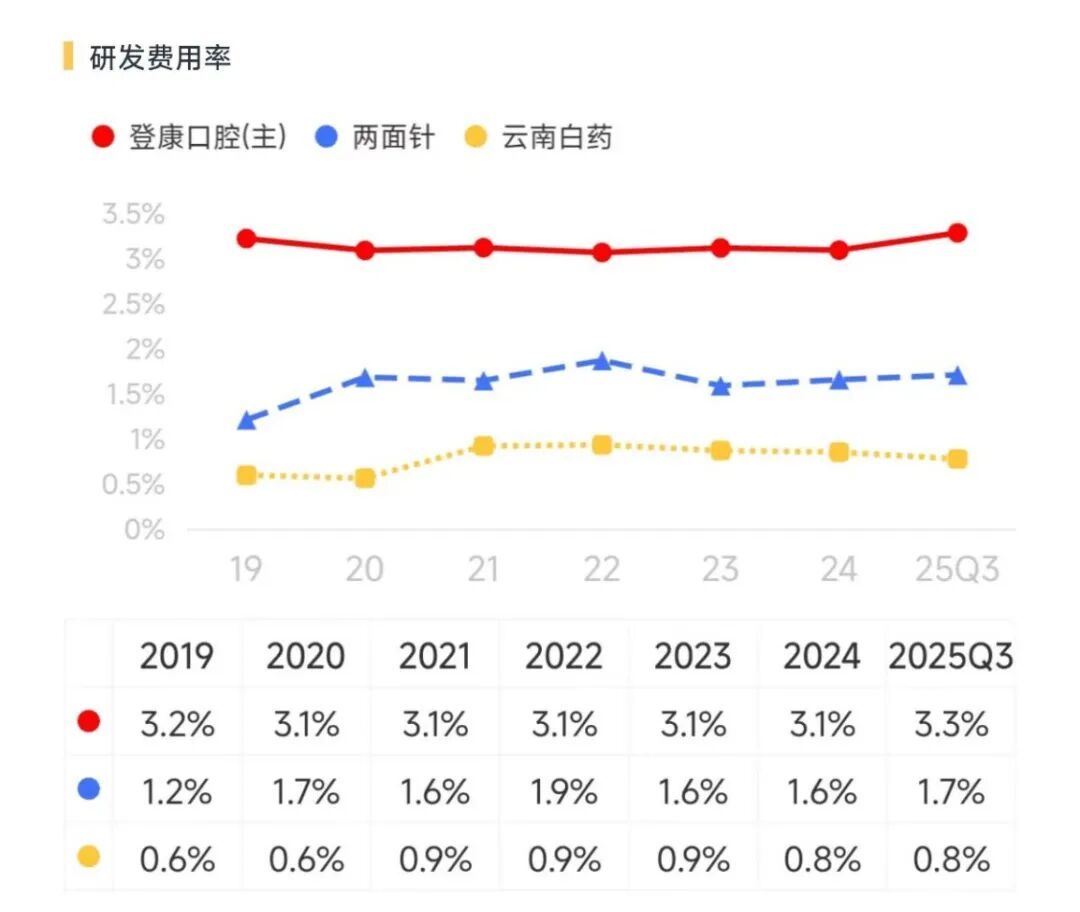 差异化优势来之不易,是公司持续投入研发的结果。过去几年间,登康口腔的研发费用率稳定在3.0%-3.5%,这个数字明显高于行业平均水平。