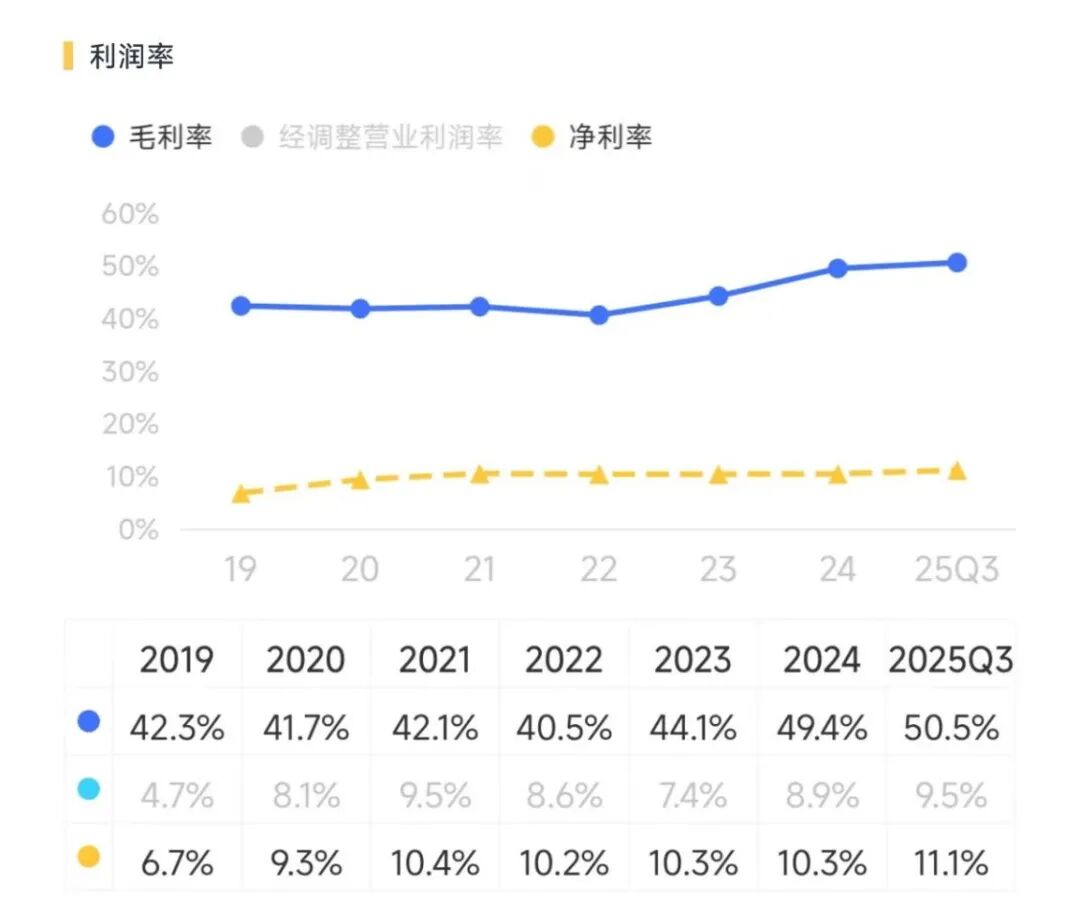 2025年上半年,登康口腔旗下中高端牙膏产品的销售占比已提升至约40%,带来的直观影响就是盈利能力的提升。2024年公司综合毛利率49.4%,同比提升5.3个百分点;在2025年前三季度,综合毛利率进一步升至50.5%。