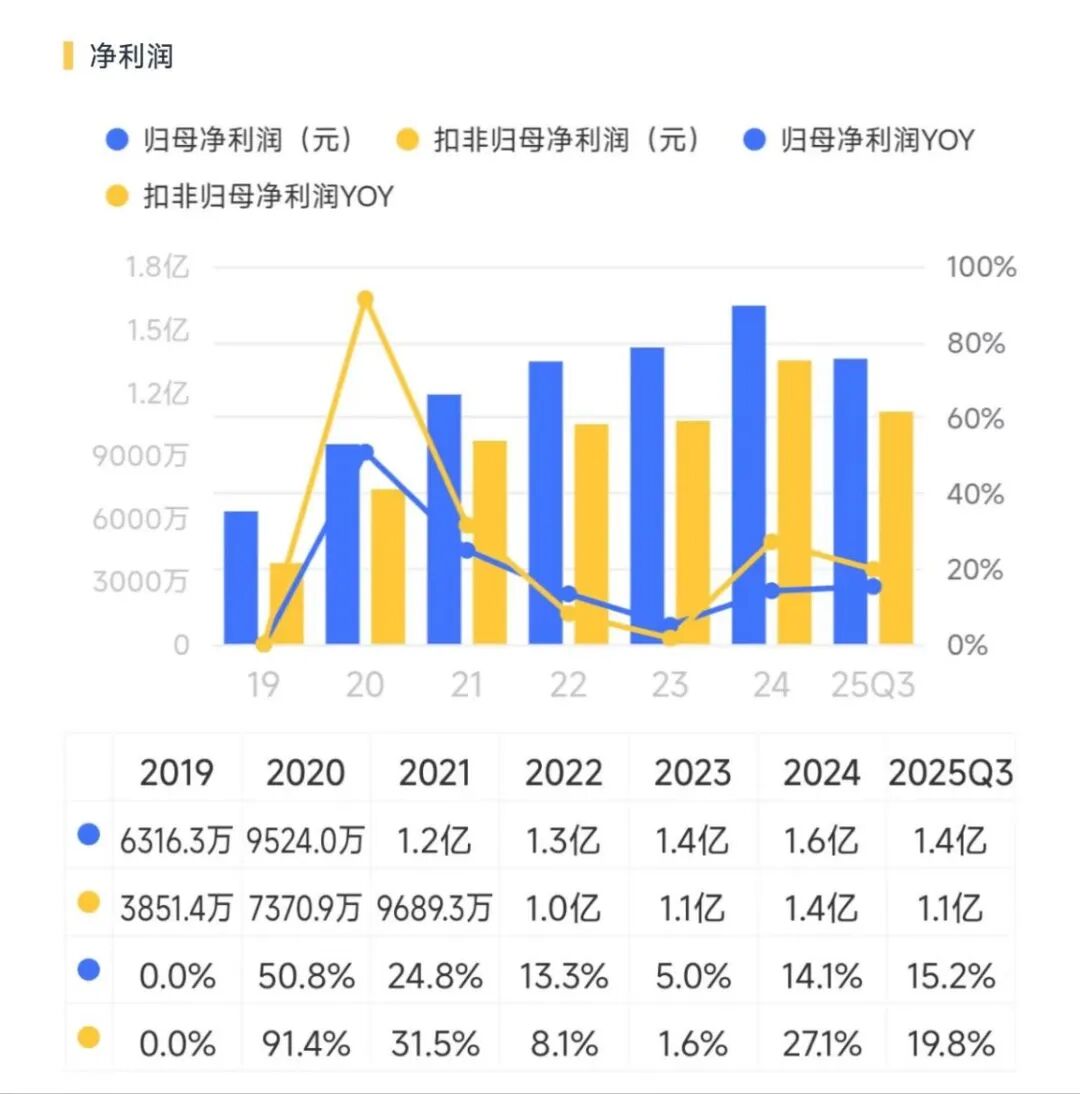 同期内利润端也交出了相匹配的增长。2024年、2025年前三季度,归母净利润分别为1.61亿、1.36亿,同比增幅分别为14.07%、15.21%。