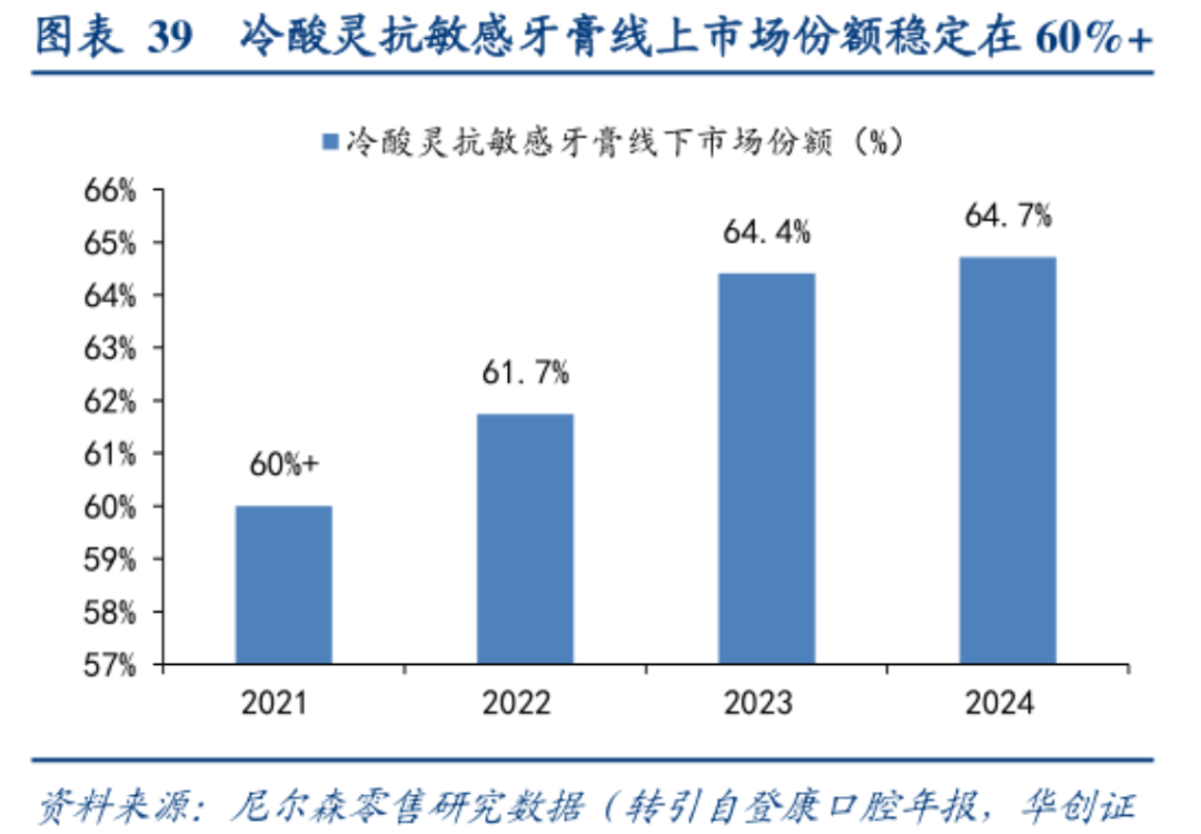 在抗敏感牙膏细分赛道,登康口腔已是绝对龙头。2021年起,公司连续四年占据60%以上的市场份额,且市占率还在逐年提升,2024年创下64.7%的新高。