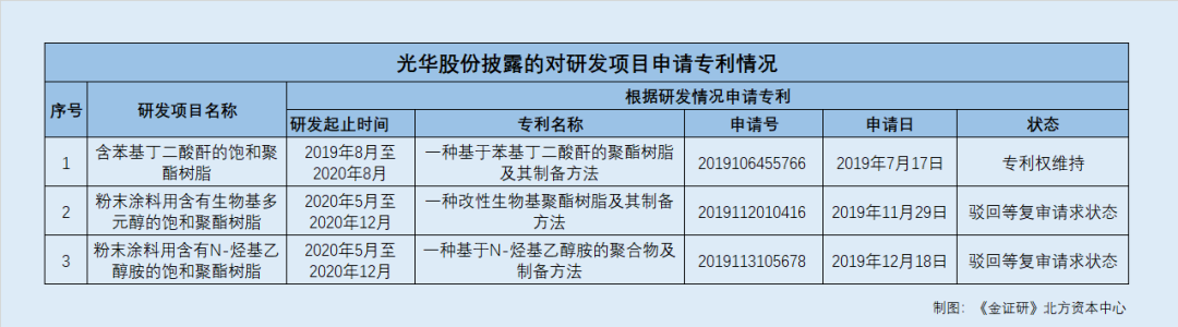 据招股书,光华股份名为的“含苯基丁二酸酐的饱和聚酯树脂”研发项目,研发起止时间为2019年8月至2020年8月,该项目研发已完成,光华股份根据该研发情况申请了请了“一种基于苯基丁二酸酐的聚酯树脂及其制备方法(专利申请号201910645576.6)”的专利。