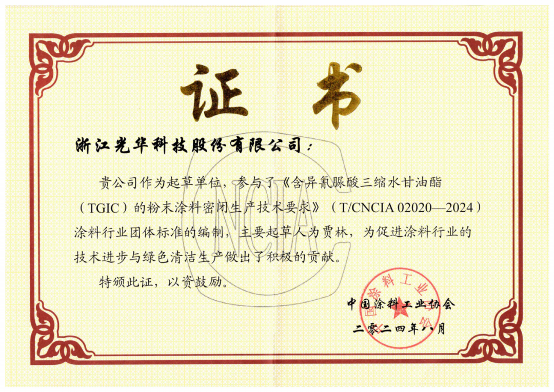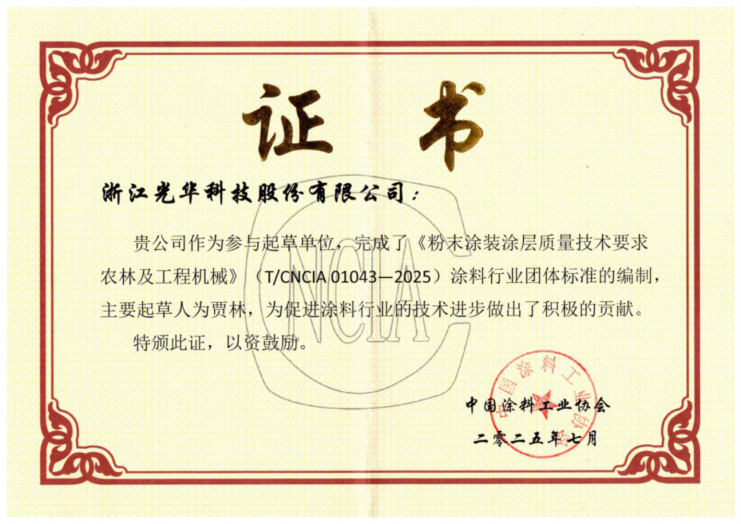 近日,浙江光华科技股份有限公司(“光华股份”)荣获由中国涂料工业协会颁发的两项行业标准参与制定证书。这不仅是对光华股份技术实力的高度认可,更是公司在粉末涂料绿色化、高质量发展道路上的重要里程碑。